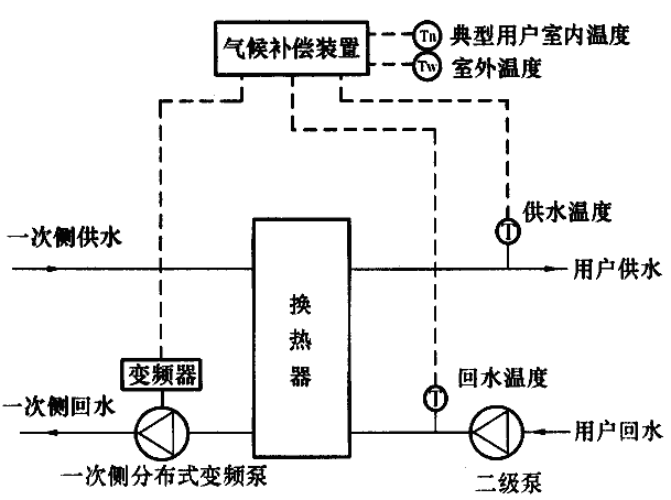 圖C.0.3-3 水-水換熱系統(tǒng)采用一次側(cè)分布式變頻控制氣候補償系統(tǒng)流程示意圖