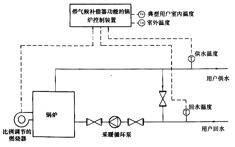 C.0.2 鍋爐房氣候補償系統(tǒng)可用于混水系統(tǒng)(圖C.0.2-1)和燃燒機控制(圖C.0.2-2)。