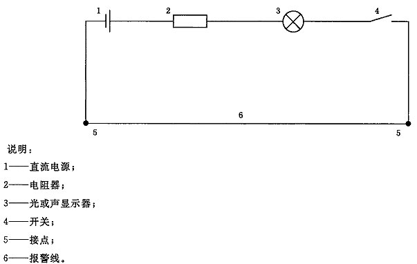 采用如圖16的回路對報警線進行導(dǎo)通性能測試,電源電壓應(yīng)小于或等于24VDC,回路短路電流應(yīng)小于100mA。連通報警線兩端時,有聲光顯示表明其導(dǎo)通性合格。