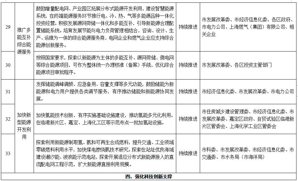 11.加快新型能源開發(fā)利用。發(fā)揮儲能調(diào)峰調(diào)頻、應急備用、容量支撐等多元功能,鼓勵儲能為新能源和電力用戶提供各類調(diào)節(jié)服務,有序推動儲能和新能源協(xié)同發(fā)展。加快氫能技術創(chuàng)新,有序?qū)嵤┗A設施建設,推動氫能多元化利用。在臨港新片區(qū)、嘉定、上海化工區(qū)等示范布點一批加氫站設施,2025年全市加氫站數(shù)量力爭達到70座。探索利用新能源制取氫、氨和可再生合成燃料,提升交通、工業(yè)領域零碳燃料利用水平,加快煤電摻燒氨技術研究。探索在站址優(yōu)良海域建設潮汐能、波浪能示范電站,探索開展適應分布式新能源接入的直流配電網(wǎng)工程示范,擴大新能源直接利用規(guī)模。
