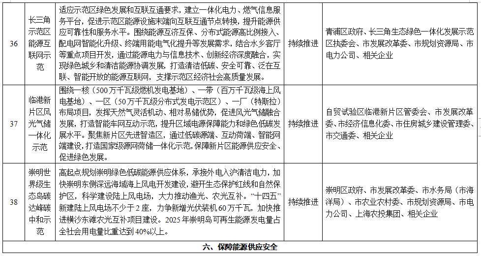 15.臨港新片區(qū)風光氣儲一體化示范。圍繞一核(500萬千瓦級燃機發(fā)電基地)、一帶(百萬千瓦級海上風電基地)、一區(qū)(50萬千瓦級分布式發(fā)電示范區(qū))、一廠(特斯拉)布局項目,發(fā)揮天然氣靈活機動、相對易儲優(yōu)勢,促進風光氣儲融合發(fā)展,打造智能車網(wǎng)互動示范,提升區(qū)域電源保障能力和綠色低碳發(fā)展水平。聚焦新片區(qū)先進智造區(qū),通過低碳源端、互動荷端、智能網(wǎng)端建設,打造國家級源網(wǎng)荷儲一體化示范,保障新片區(qū)能源供應安全、促進綠色發(fā)展。