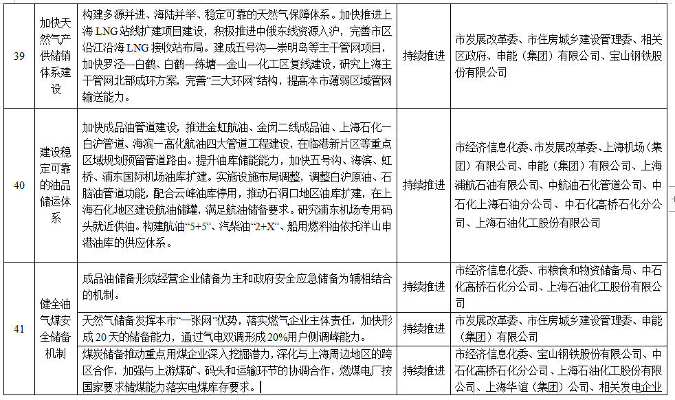 19.健全油氣煤安全儲備機制。加快建立規(guī)模合理、責任清晰、響應靈敏、應對有力的能源安全儲備體系。成品油儲備形成經(jīng)營企業(yè)儲備為主和政府安全應急儲備為輔相結(jié)合的機制。天然氣儲備發(fā)揮本市“一張網(wǎng)”優(yōu)勢,落實燃氣企業(yè)主體責任,加快形成20天的儲備能力,通過氣電雙調(diào)形成20%用戶側(cè)調(diào)峰能力。煤炭儲備推動重點用煤企業(yè)深入挖掘潛力,深化與上海周邊地區(qū)的跨區(qū)合作,加強與上游煤礦、碼頭和運輸環(huán)節(jié)的協(xié)調(diào)合作,燃煤電廠按國家要求儲煤能力落實電煤庫存要求。