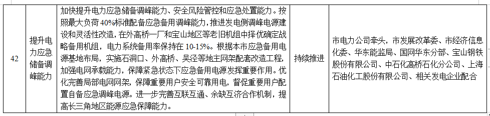 20.提升電力應急儲備調(diào)峰能力。加快提升電力應急儲備調(diào)峰能力、安全風險管控和應急處置能力。按照最大負荷40%標準配備應急備用調(diào)峰能力,推進發(fā)電側(cè)調(diào)峰電源建設和靈活性改造,在外高橋一廠和寶山地區(qū)等老舊機組中擇優(yōu)確定戰(zhàn)略備用機組,電力系統(tǒng)備用率保持在10-15%。根據(jù)本市應急備用電源基地布局,實施石洞口、外高橋、吳涇等地主網(wǎng)架配套改造工程,加強電網(wǎng)承載能力,保障緊急狀態(tài)下應急備用電源發(fā)揮重要作用。優(yōu)化完善局部電網(wǎng)網(wǎng)架,保障重要用戶安全可靠用電,督促重要用戶配置自備應急調(diào)峰電源。進一步完善互聯(lián)互通、余缺互濟合作機制,提高長三角地區(qū)能源應急保障能力。