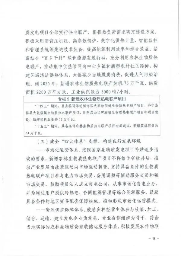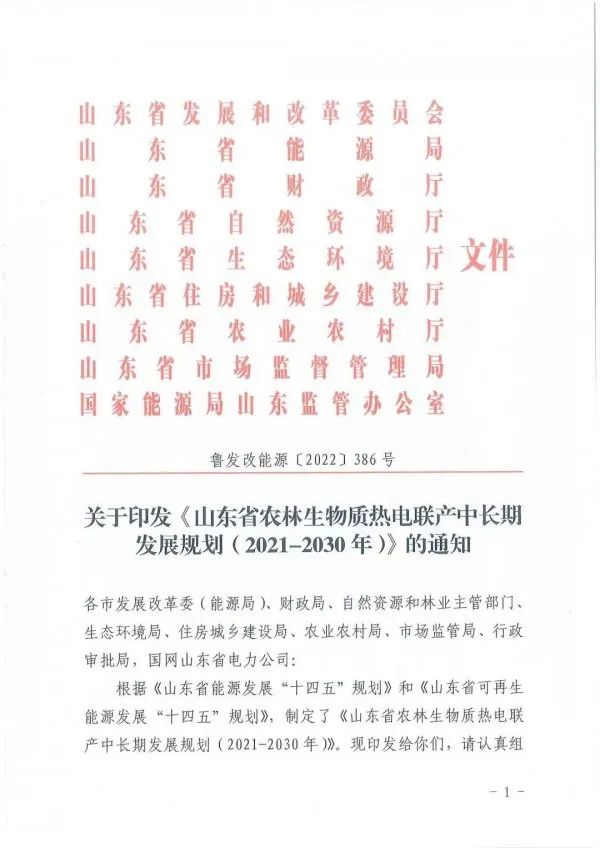 近日,山東省發(fā)展和改革委員會(huì)、山東省能源局、山東省財(cái)政廳等9單位聯(lián)合印發(fā)通知,公布《山東省農(nóng)林生物質(zhì)熱電聯(lián)產(chǎn)中長(zhǎng)期發(fā)展規(guī)劃(2021—2030年)》。