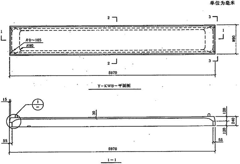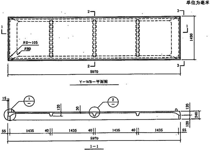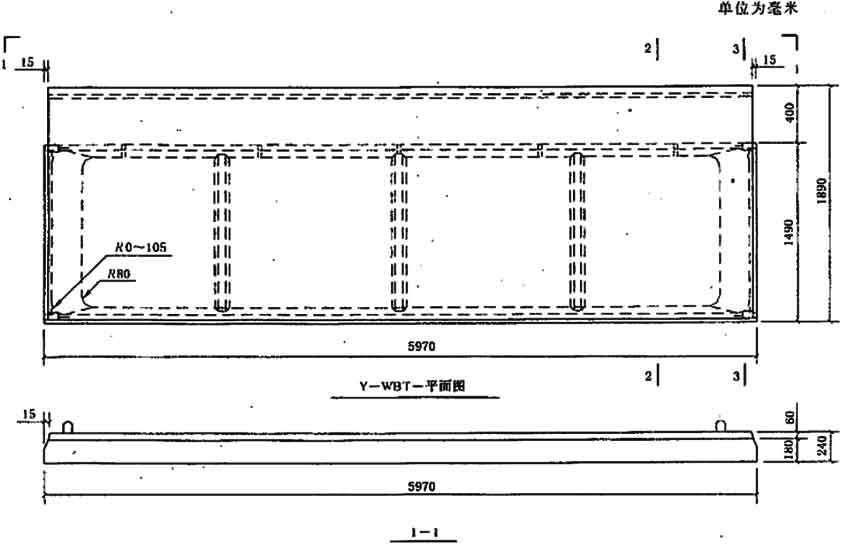 示例3:荷載等級(jí)為1級(jí),主筋類別為冷拉HRB335級(jí)熱扎帶肋鋼筋的預(yù)應(yīng)力混凝土嵌板的標(biāo)記為Y-KWB-1Ⅱ 。