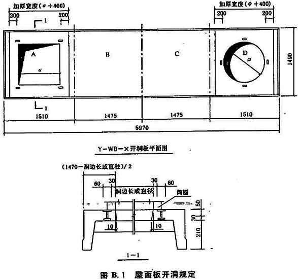 屋面板在縱、橫肋構(gòu)成的區(qū)格內(nèi)均允許開洞,且允許在四個(gè)區(qū)格內(nèi)同時(shí)開洞,開洞區(qū)格面板需加厚,開洞形式、尺寸及加厚尺寸應(yīng)符合表B.1的規(guī)定,具體位置見圖B.1。