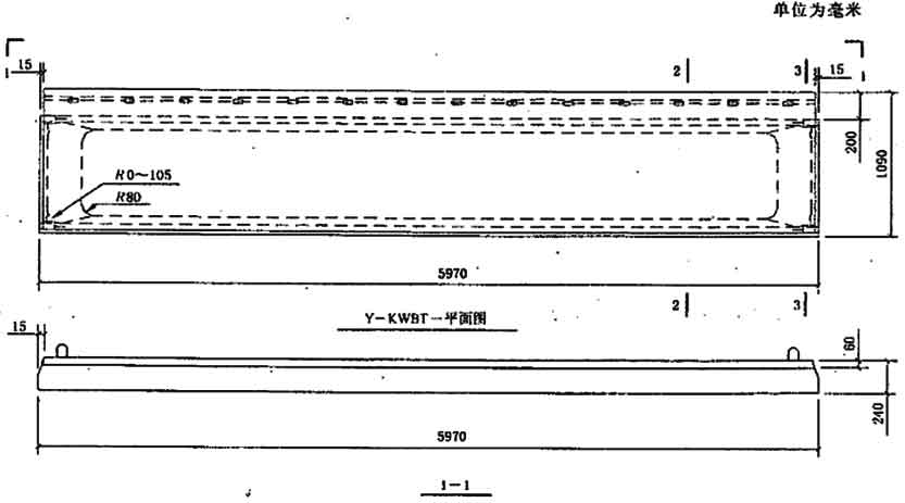 示例4:荷載等級(jí)為1級(jí),主筋類別為冷拉HRB335級(jí)熱扎帶肋鋼筋的預(yù)應(yīng)力混凝土嵌板檐口板的標(biāo)記為Y-KWBT-1Ⅱ 。