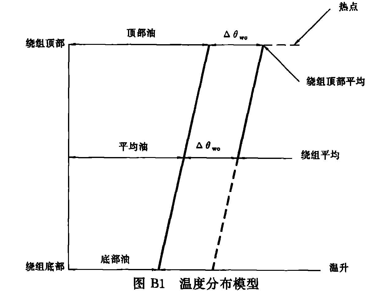冷卻油流入繞組底部,并且具有“底部油溫度”,底部油向上流經(jīng)繞組,并假設(shè)其溫度是隨繞組高度呈線性上升,繞組損耗產(chǎn)生的熱量從繞組表面向油傳遞,熱量的傳遞要求繞組本身和繞組周圍油之間存在溫度差(假設(shè):在所有不同高度處的溫差均相同),所以,繞組溫度分布線與油溫度分布線呈兩條平行直線(見圖B1)。