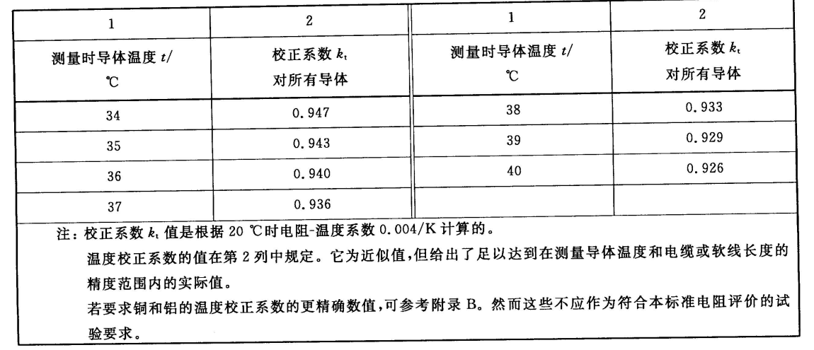 導(dǎo)體直流電阻的測(cè)量在整根電纜長(zhǎng)度或軟線上,或者在長(zhǎng)度至少為1 m的電纜樣品或軟線上和室溫下進(jìn)行,并記錄測(cè)量時(shí)的溫度。通過(guò)表A.1提供的校正系數(shù)修正測(cè)量電阻值。