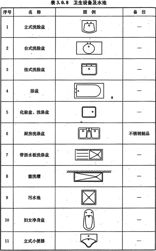3.0.8 衛(wèi)生設(shè)備及水池的圖例宜符合表3.0.8的要求。