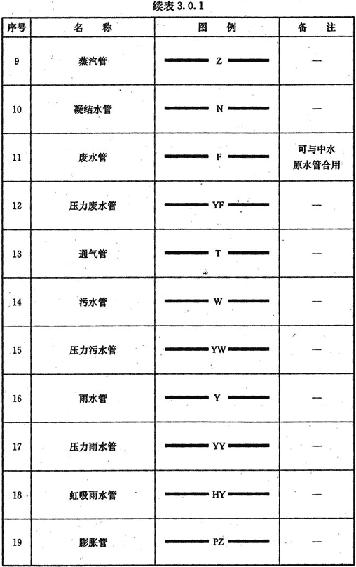 3.0.1 管道類別應(yīng)以漢語拼音字母表示,管道圖例宜符合表3. 0. 1的要求。