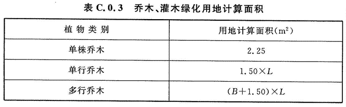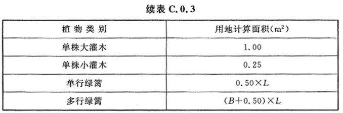 C.0. 3 喬木、灌木綠化用地計算面積應(yīng)符合表C.0.3的規(guī)定。