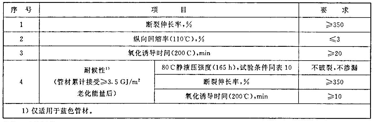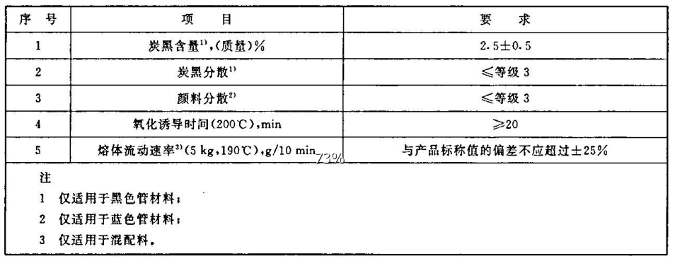4.2 使用混配料生產(chǎn)聚乙烯管材,混配料為藍(lán)色或黑色,基本性能應(yīng)符合表2要求。藍(lán)色管用材料應(yīng)能保證使用該材料制造的管材的耐候性符合表12的要求。對于PE 63級材料,也可采用管材級基礎(chǔ)樹脂加母料的方法生產(chǎn)聚乙烯管材,對材料性能的要求自管材上取樣進(jìn)行測試。