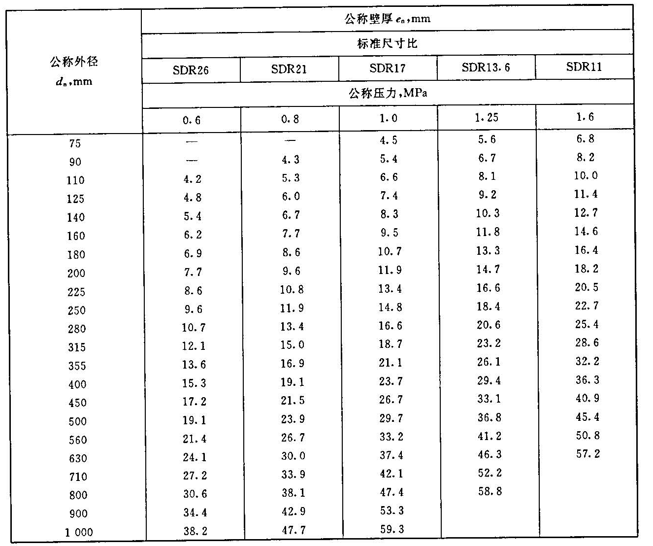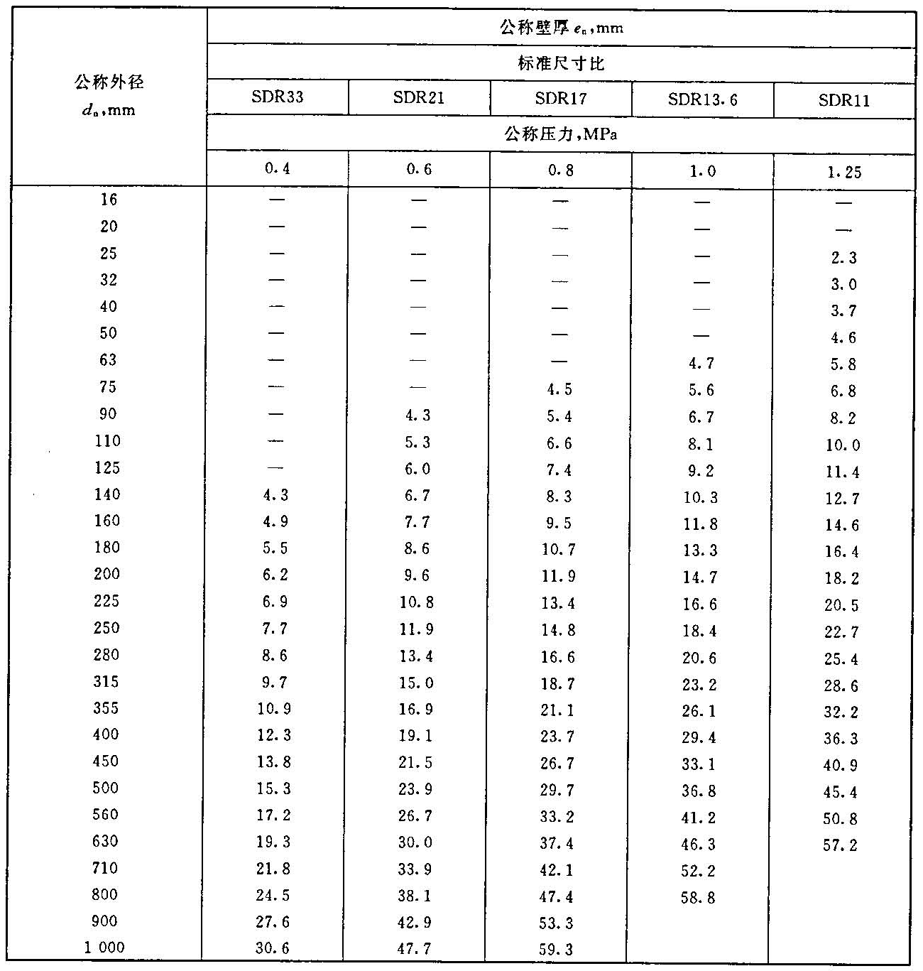 5.4 使用PE 63、PE 80和PEl00等級材料制造的管材,按照選定的公稱壓力,采用表3中的設(shè)計應(yīng)力而確定的公稱外徑和壁厚應(yīng)分別符合表4、表5和表6的規(guī)定。