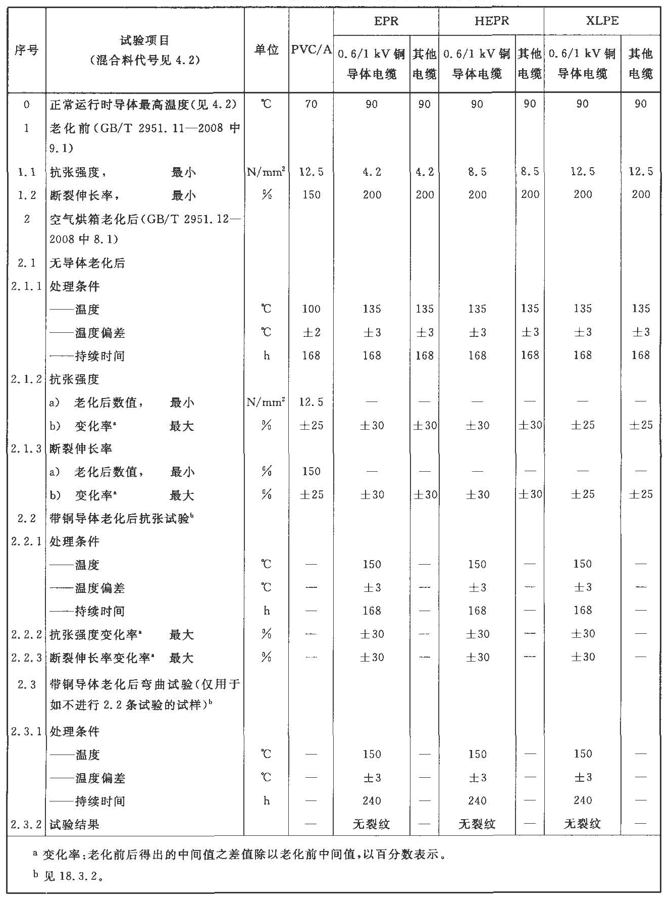 表18 護(hù)套混合料機(jī)械性能試驗要求(老化前后)