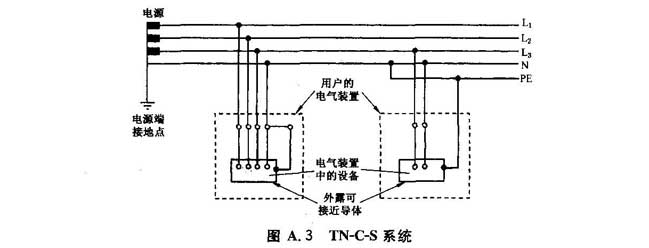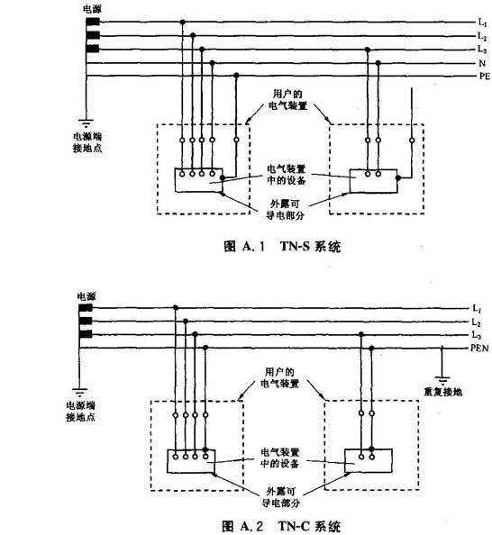 TN—S系統(tǒng):整個系統(tǒng)的中性線與保護線是分開的(圖A.1);