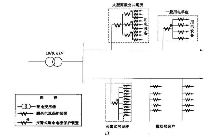 注3:圖c)所示分級保護模式適用于網絡健康水平較高、負荷類型相對比較復雜的城鎮(zhèn)配電網,在用電單位內采用分級保護時,還應考慮采用防電氣火災的剩余電流保護裝置。