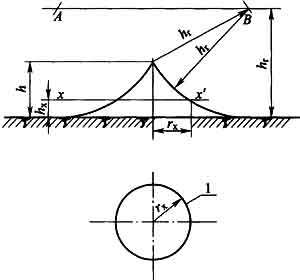 4)接閃桿在hx高度的xx'平面上和在地面上的保護(hù)半徑,按下列公式確定: