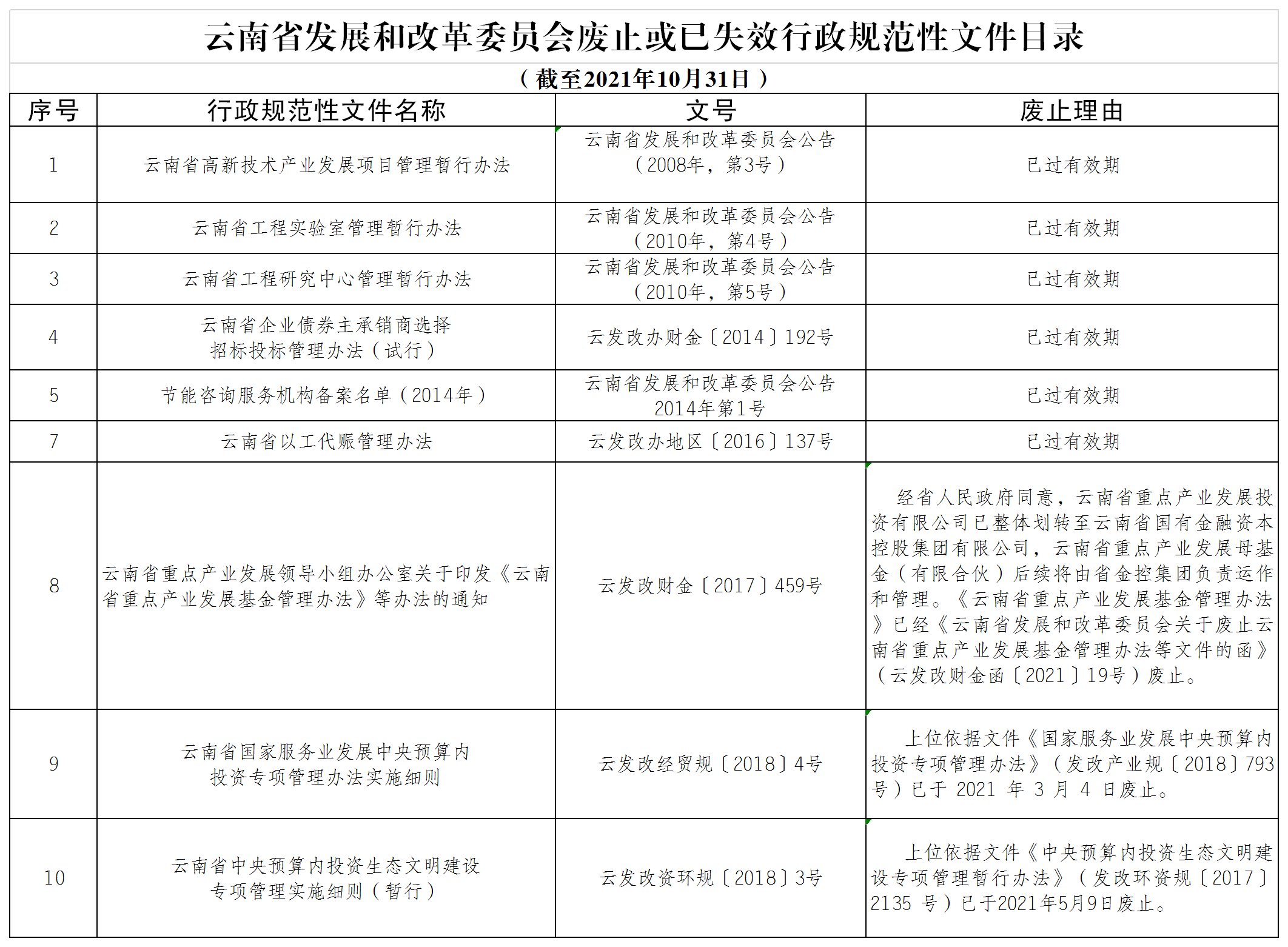 云南省發(fā)展和改革委員會(huì)廢止或已失效行政規(guī)范性文件目錄(截至2021年10月31日)