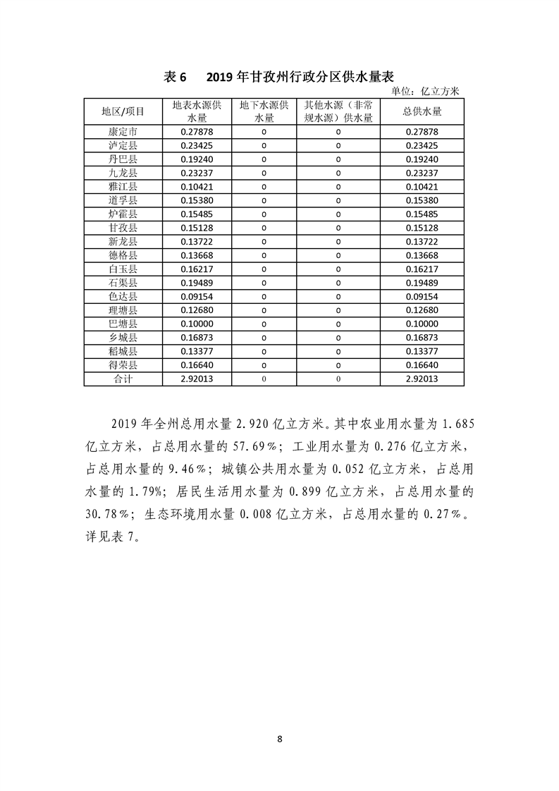 2019年全州總供水量2.920億立方米。其中,地表水供水量2.920 億立方米,占總供水量的100.00%。