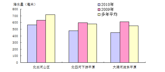 從水資源分區(qū)看,山區(qū)降水量大于平原降水量,北四河下游平原大于大清河淀東平原。各分區(qū)降水量與上年比較均偏少,其中大清河淀東平原比上年度偏少最大,為26.87%;與多年平均值比較均偏少,其中北三河山區(qū)偏少最大,為21.46%。2010年水資源分區(qū)降水量與上年及多年平均值比較見圖2。