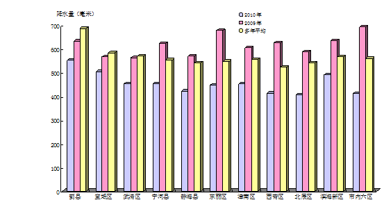 從行政分區(qū)看,薊縣降水量最大,為550.7毫米;北辰區(qū)最小,為405.0毫米。與上年比較,各行政分區(qū)均偏少,減少最多為市內(nèi)六區(qū),偏少40.52%。與多年平均比較,各行政分區(qū)均偏少,減少最多為市內(nèi)六區(qū),偏少26.60%。2010年行政分區(qū)降水量與上年及多年平均值比較見圖1。