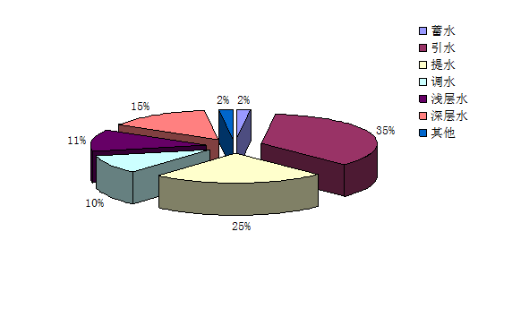 在地表水供水中,蓄水工程供水0.41億立方米,引水工程供水7.94億立方米,提水工程供水5.53億立方米,引黃調(diào)水量2.28億立方米;地下水供水中,淺層地下水3.02億立方米,深層地下水2.85億立方米。2010年天津市供水量組成見圖13。