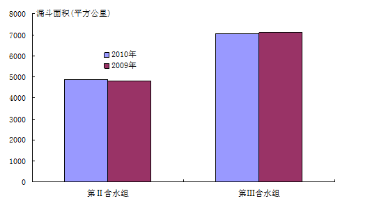 第Ⅲ承壓含水組漏斗中心在津南區(qū)辛莊鎮(zhèn),2010年末漏斗中心埋深101.14米,比上年同期水位下降了0.30米,漏斗面積7059平方公里,比上年同期減少57平方公里。2010年天津市平原區(qū)水位降落漏斗面積與上年比較見圖11。