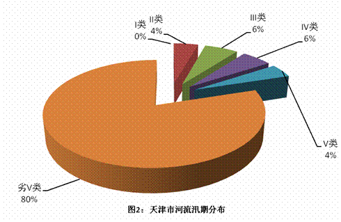 2010年汛期評(píng)價(jià)河長(zhǎng)為1588.54公里,其中II類水69.34公里,占評(píng)價(jià)河長(zhǎng)的4%,III類水95.50公里,占評(píng)價(jià)河長(zhǎng)的6%,IV類水85.70公里,占評(píng)價(jià)河長(zhǎng)的6%,V類水68.40公里,占評(píng)價(jià)河長(zhǎng)的4%,劣V類水1265.20公里,占評(píng)價(jià)河長(zhǎng)的80% 。2010年天津市主要河流汛期水質(zhì)分布見圖20。