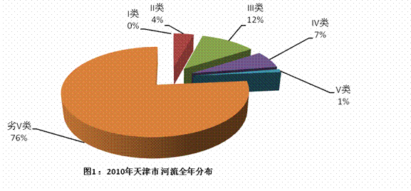 2010年全年評(píng)價(jià)河長(zhǎng)為1625.94公里,其中II類水69.34公里,占評(píng)價(jià)河長(zhǎng)的4%,III類水189.20公里,占評(píng)價(jià)河長(zhǎng)的12%, IV類水106.00公里,占評(píng)價(jià)河長(zhǎng)的7%,V類水19.00 公里,占評(píng)價(jià)河長(zhǎng)的1%,劣V類水1242.40公里,占評(píng)價(jià)河長(zhǎng)的76% 。2010年天津市主要河流全年水質(zhì)分布見圖18。