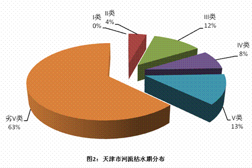 2010年枯水期評(píng)價(jià)河長(zhǎng)為1588.54公里,其中II類水69.34公里,占評(píng)價(jià)河長(zhǎng)的4%,III類水189.60公里,占評(píng)價(jià)河長(zhǎng)的12%,IV類水128.70公里,占評(píng)價(jià)河長(zhǎng)的8%,V類水202.10公里,占評(píng)價(jià)河長(zhǎng)的13%,劣V類水998.80公里,占評(píng)價(jià)河長(zhǎng)的63% 。2010年天津市主要河流枯水期水質(zhì)分布見圖19。