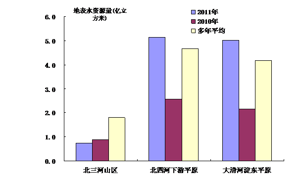 從水資源分區(qū)看,北三河山區(qū)0.73億立方米,比上年偏少17.1%, 比多年平均偏少59.7%;北四河下游平原5.15億立方米,比上年偏多101.2%,比多年平均偏多10.3%;大清河淀東平原5.01億立方米,比上年偏多134.1%,比多年平均偏多20.1%。