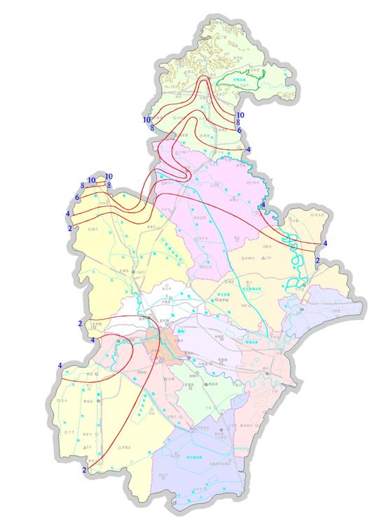 2011年全市平原區(qū)上升區(qū)(水位上升0.5米以上)面積358平方公里,平均水位比上年上升0.94米,蓄水量增加0.27億立方米;下降區(qū)(水位下降0.5米以上)面積365平方公里,平均水位比上年下降1.02米,蓄水量減少0.30億立方米;相對(duì)穩(wěn)定區(qū)(水位變幅在±0.5米以內(nèi))面積3211平方公里,平均水位比上年下降0.06米,蓄水量減少0.13億立方米。 2011年天津市平原區(qū)淺層地下水動(dòng)態(tài)變化見圖11。2011年天津市淺層地下水埋深等值線圖見圖12。