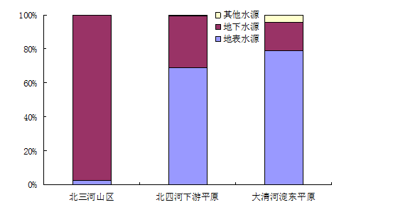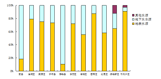 行政分區(qū)中,市內(nèi)六區(qū)、西青區(qū)、濱海新區(qū)的塘沽區(qū),地表水源約占供水水源的90%。薊縣、靜??h,地下水源約占供水水源的90%。污水處理回用和海水淡化主要用于市內(nèi)六區(qū)和濱海新區(qū)。