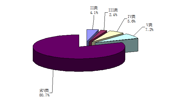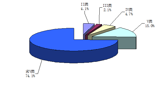2011年全市廢污水排放量5.77億噸。2011年全年評(píng)價(jià)河長(zhǎng)為1709.8公里,其中II類水河長(zhǎng)69.3公里,占評(píng)價(jià)河長(zhǎng)的4.1%;III類水河長(zhǎng)50.2公里,占評(píng)價(jià)河長(zhǎng)的2.9%; IV類水河長(zhǎng)57.4公里,占評(píng)價(jià)河長(zhǎng)的3.4%;V類水河長(zhǎng)142.4公里,占評(píng)價(jià)河長(zhǎng)的8.3%;劣V類水河長(zhǎng)1390.5公里,占評(píng)價(jià)河長(zhǎng)的81.3% 。全市河流污染比較嚴(yán)重。