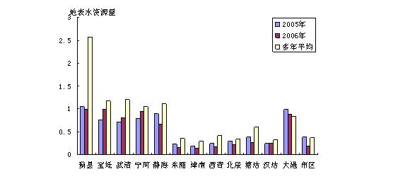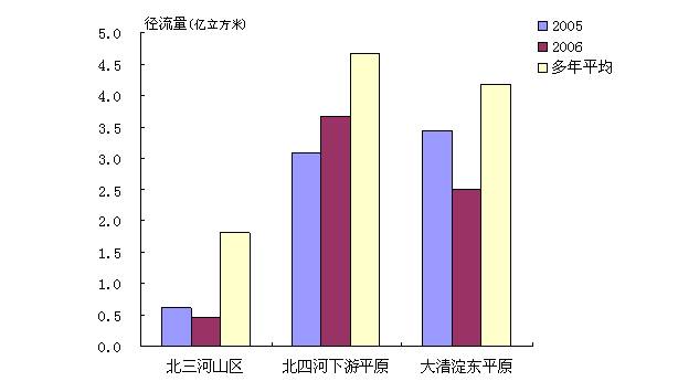 流域分區(qū)中,北三河山區(qū)0.45億立方米,比上年偏少27.42%,比多年平均偏少75.14%;北四河下游平原3.67億立方米,比上年偏多19.16%,比多年平均偏少21.41%;大清河淀東平原2.50億立方米,比上年偏少27.11%,比多年平均偏少40.05%。2006年各流域分區(qū)地表水資源量與上年及多年平均比較見圖7。