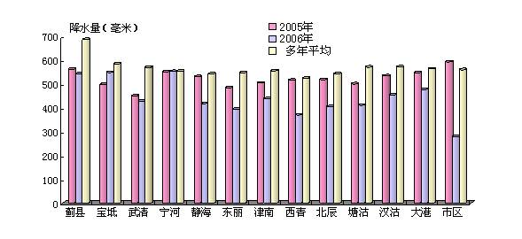 2006年天津市平均降水量468.1毫米,折合水量55.80億立方米,比上年偏少9.47%,比多年平均值68.53億立方米(1956?2000年)偏少18.58%,屬于偏枯年份。