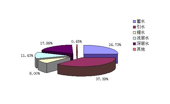在地表水供水中,蓄水工程供水5.68億立方米,引水工程供水8.58億立方米,提水工程供水1.84億立方米;地下水供水中,淺層地下水2.63億立方米,深層地下水4.13億立方米。2006年天津市供水量組成見圖14.