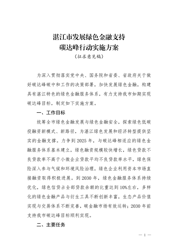 關(guān)于公開征求《湛江市發(fā)展綠色金融支持碳達(dá)峰行動實(shí)施方案(征求意見稿)》意見的公告