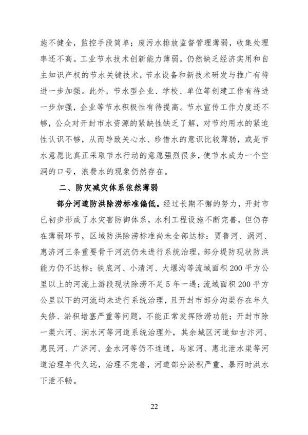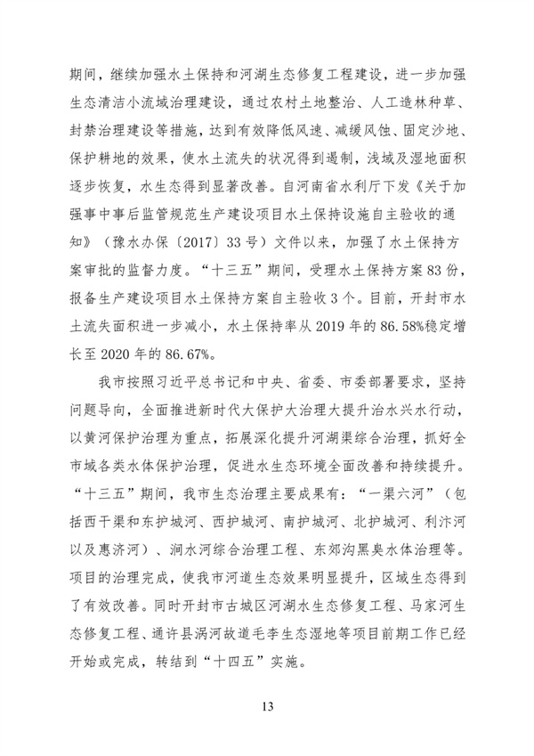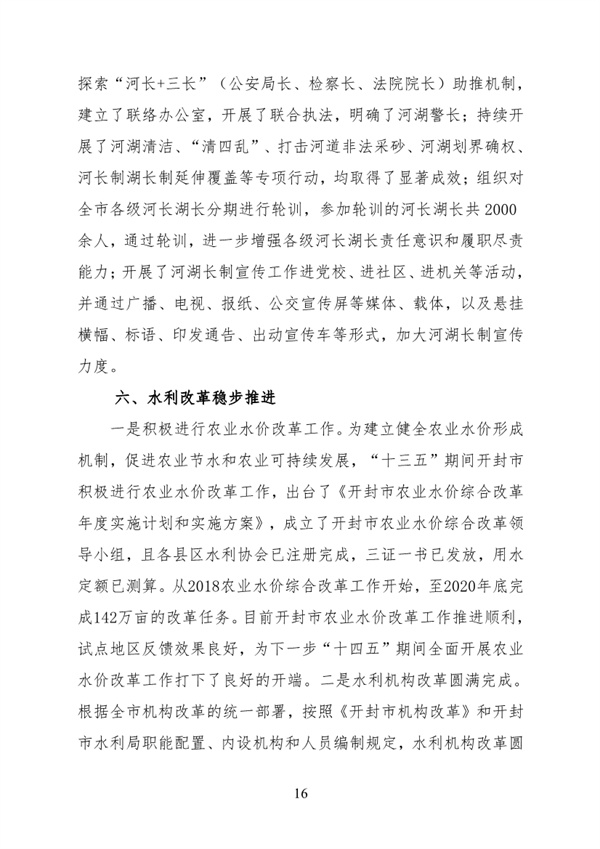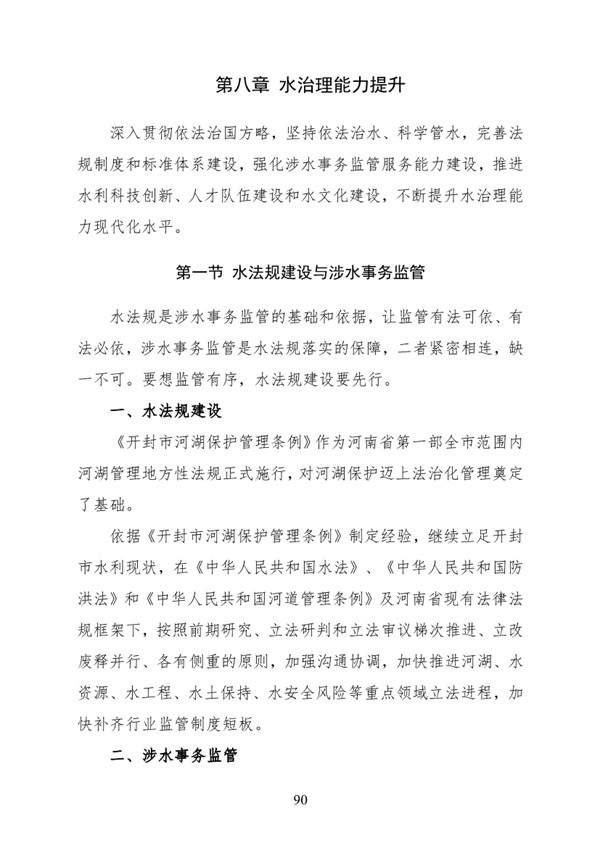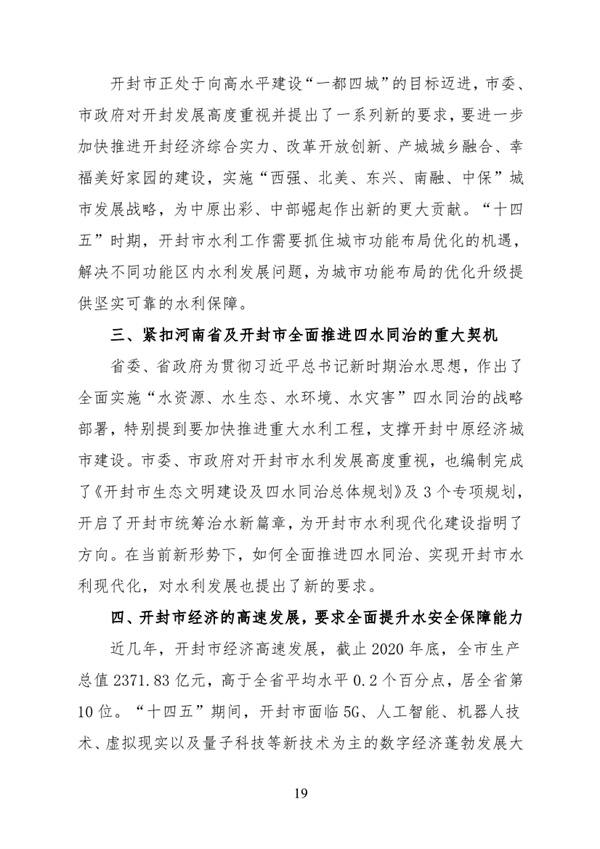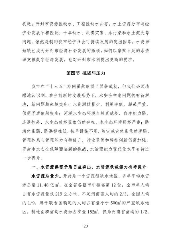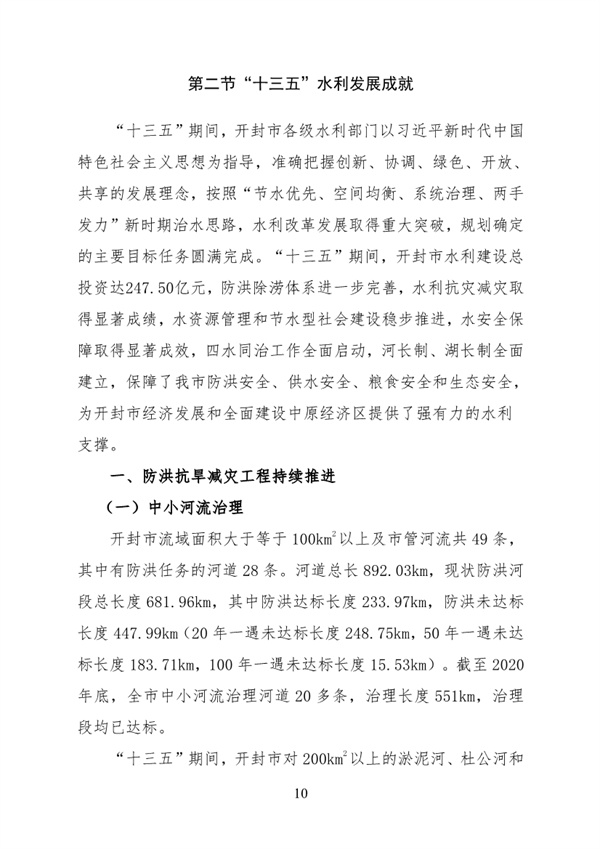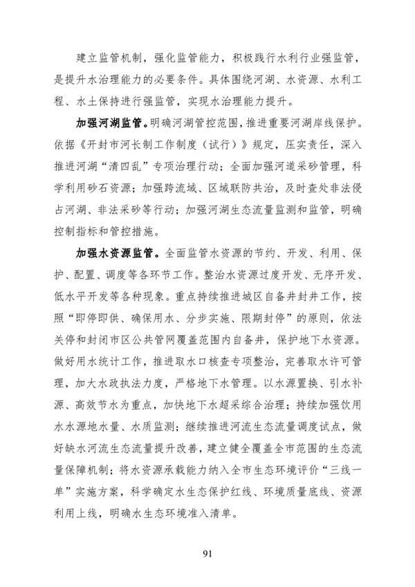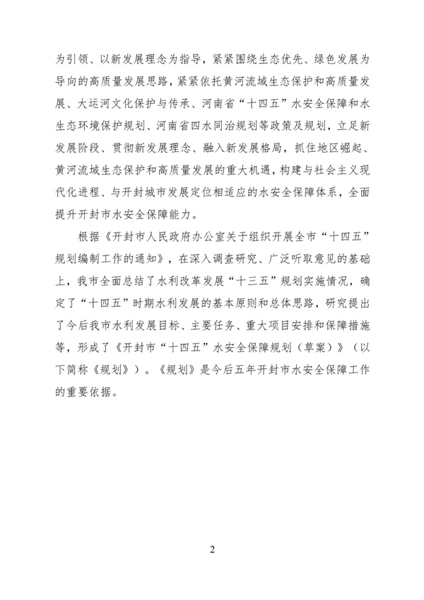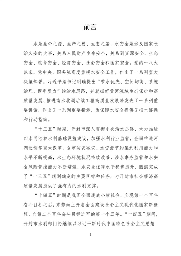8月15日,開封市人民政府印發(fā)《開封市“十四五”水安全保障規(guī)劃》(以下簡(jiǎn)稱《規(guī)劃》)?!兑?guī)劃》系統(tǒng)總結(jié)了“十三五”期間開封市水利改革發(fā)展取得的顯著成果,確定了“十四五”時(shí)期開封市水利發(fā)展的總體思路,深刻分析了面臨的形勢(shì)和問(wèn)題,研究提出了今后五年開封市水利發(fā)展目標(biāo)、主要任務(wù)、重大項(xiàng)目安排和保障措施等,是指導(dǎo)“十四五”時(shí)期開封市水安全保障工作的重要依據(jù)。