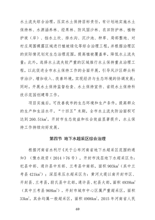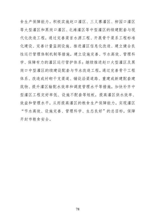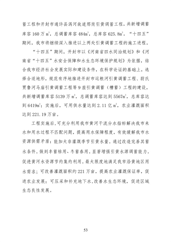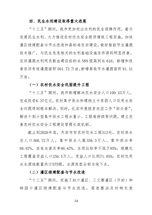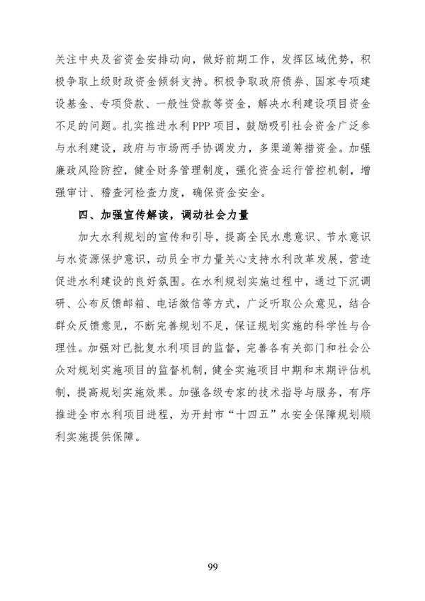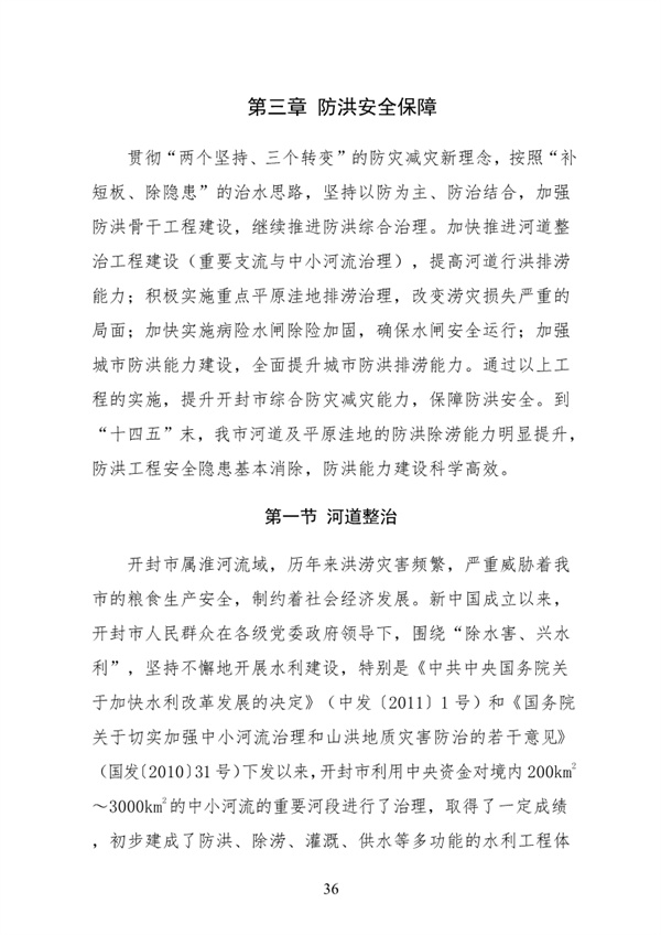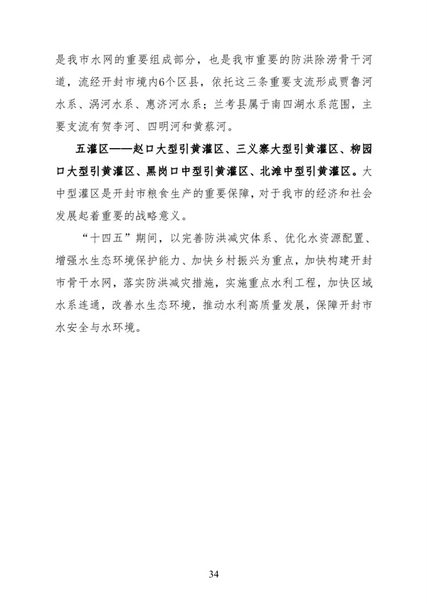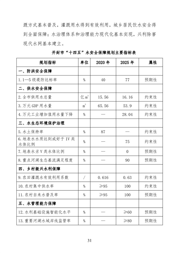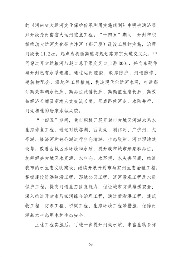 根據(jù)規(guī)劃,“十四五”期間,開封市以完善防洪減災(zāi)體系、優(yōu)化水資源配置、增強(qiáng)水生態(tài)環(huán)境保護(hù)能力、加快鄉(xiāng)村振興為重點(diǎn),從防洪安全保障、供水安全保障、水生態(tài)環(huán)境保護(hù)治理、鄉(xiāng)村振興水利保障等方面,謀劃一批重大水安全保障工程。通過(guò)加強(qiáng)防洪骨干工程建設(shè)、提升水資源統(tǒng)籌調(diào)配能力、持續(xù)改善水生態(tài)環(huán)境、加大農(nóng)業(yè)農(nóng)村水利基礎(chǔ)設(shè)施建設(shè)等措施,全面提升開封市水旱災(zāi)害防御能力、水資源管理能力、河湖管理能力、水利建設(shè)能力和現(xiàn)代管水、治水能力,保障開封市水安全與水環(huán)境。