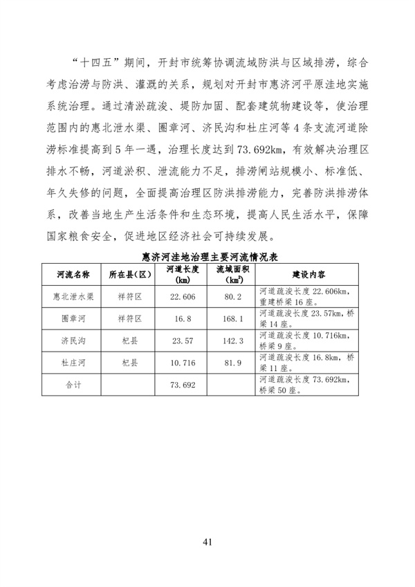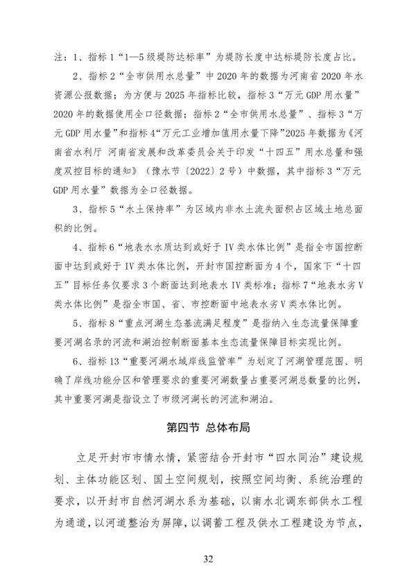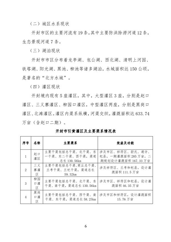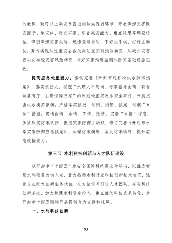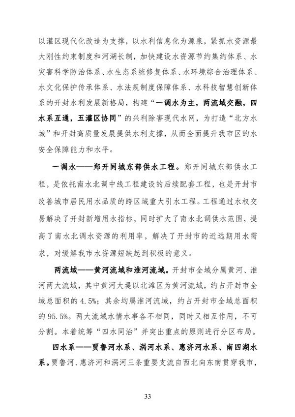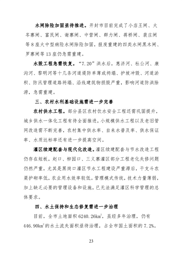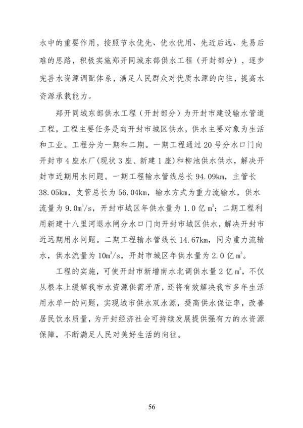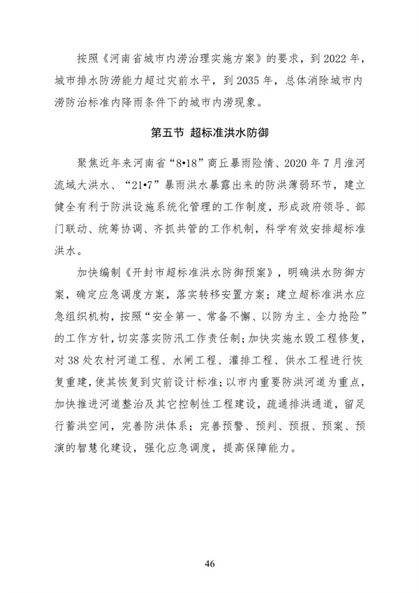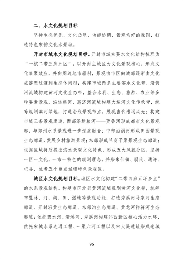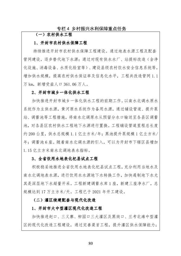 根據(jù)規(guī)劃,“十四五”期間,開封市以完善防洪減災(zāi)體系、優(yōu)化水資源配置、增強(qiáng)水生態(tài)環(huán)境保護(hù)能力、加快鄉(xiāng)村振興為重點(diǎn),從防洪安全保障、供水安全保障、水生態(tài)環(huán)境保護(hù)治理、鄉(xiāng)村振興水利保障等方面,謀劃一批重大水安全保障工程。通過(guò)加強(qiáng)防洪骨干工程建設(shè)、提升水資源統(tǒng)籌調(diào)配能力、持續(xù)改善水生態(tài)環(huán)境、加大農(nóng)業(yè)農(nóng)村水利基礎(chǔ)設(shè)施建設(shè)等措施,全面提升開封市水旱災(zāi)害防御能力、水資源管理能力、河湖管理能力、水利建設(shè)能力和現(xiàn)代管水、治水能力,保障開封市水安全與水環(huán)境。