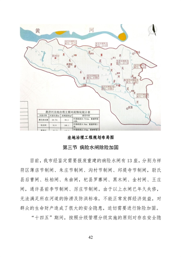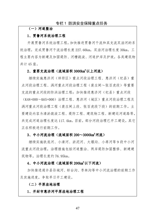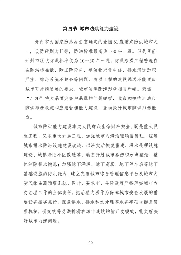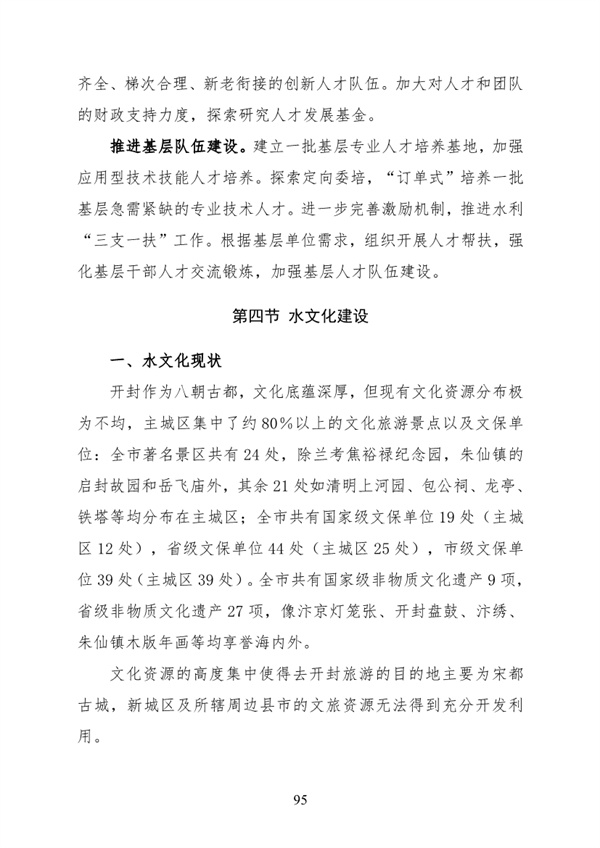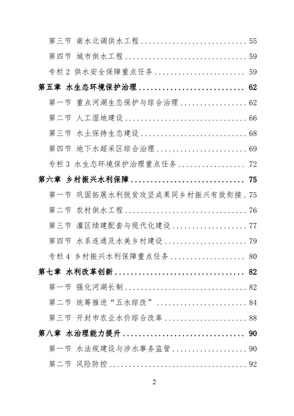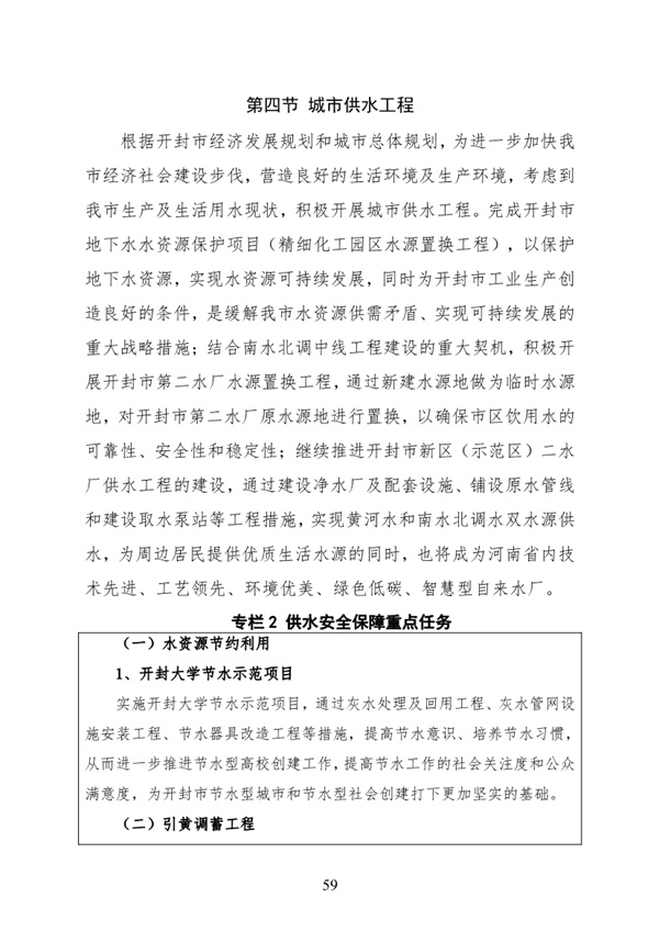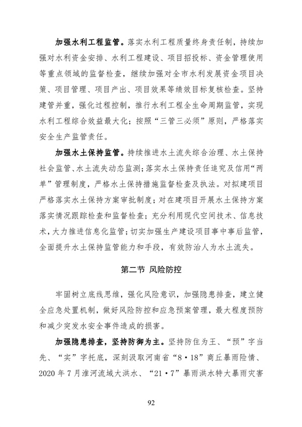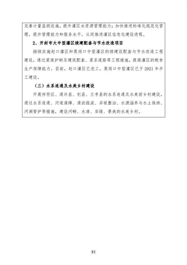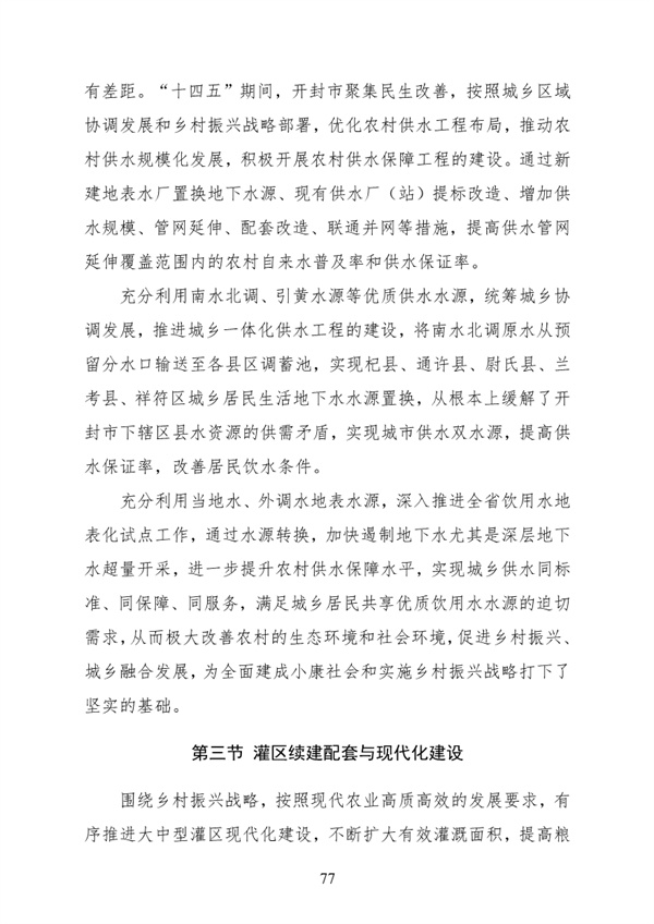 根據(jù)規(guī)劃,“十四五”期間,開封市以完善防洪減災(zāi)體系、優(yōu)化水資源配置、增強(qiáng)水生態(tài)環(huán)境保護(hù)能力、加快鄉(xiāng)村振興為重點(diǎn),從防洪安全保障、供水安全保障、水生態(tài)環(huán)境保護(hù)治理、鄉(xiāng)村振興水利保障等方面,謀劃一批重大水安全保障工程。通過(guò)加強(qiáng)防洪骨干工程建設(shè)、提升水資源統(tǒng)籌調(diào)配能力、持續(xù)改善水生態(tài)環(huán)境、加大農(nóng)業(yè)農(nóng)村水利基礎(chǔ)設(shè)施建設(shè)等措施,全面提升開封市水旱災(zāi)害防御能力、水資源管理能力、河湖管理能力、水利建設(shè)能力和現(xiàn)代管水、治水能力,保障開封市水安全與水環(huán)境。
