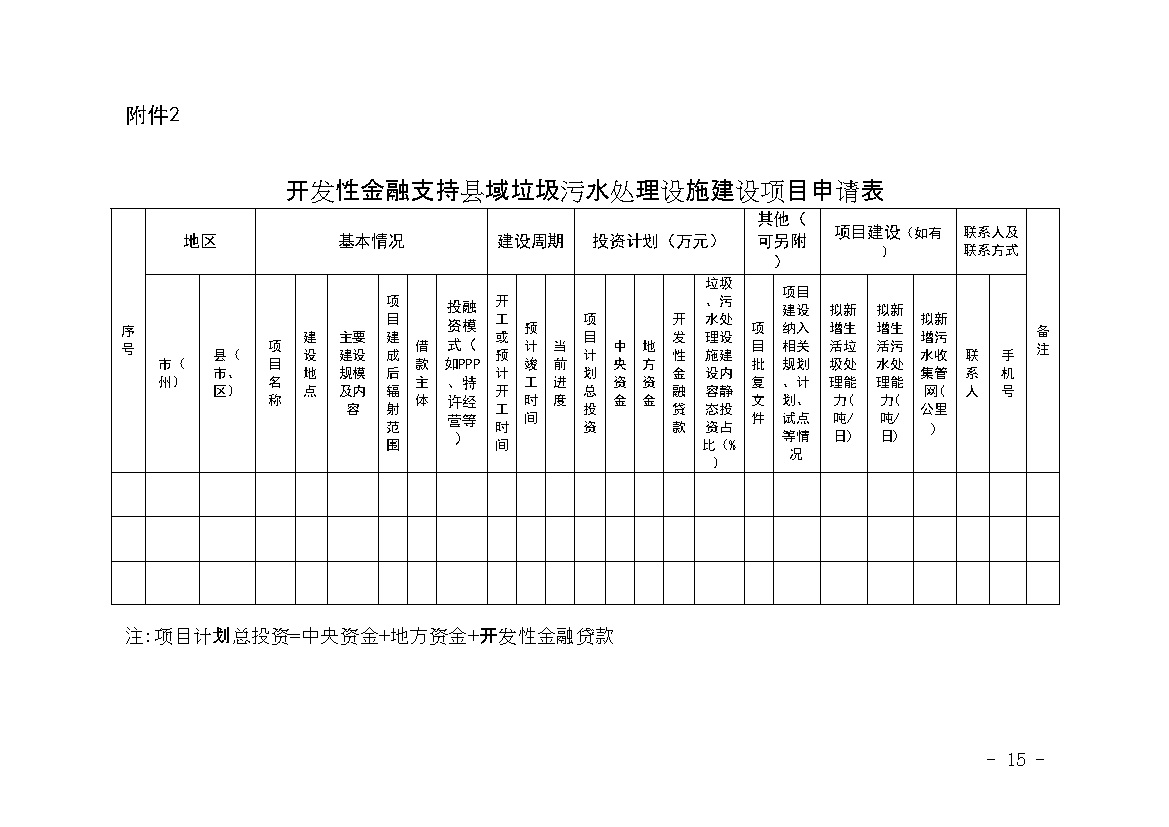 儲備庫:項目申請表中要素齊全的項目將被自動納入開發(fā)銀行與省住建廳共同設(shè)立的縣域生活垃圾污水處理項目儲備庫。