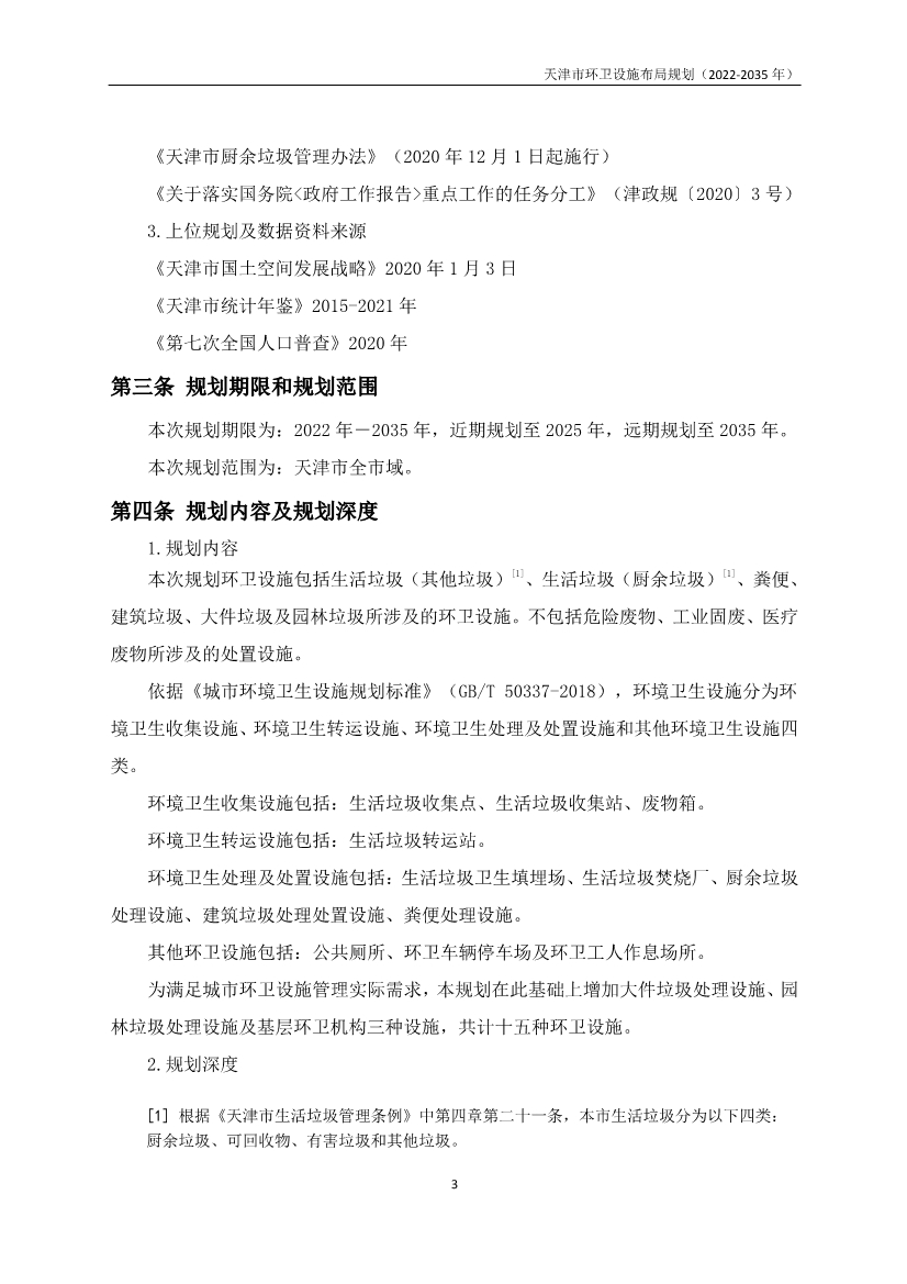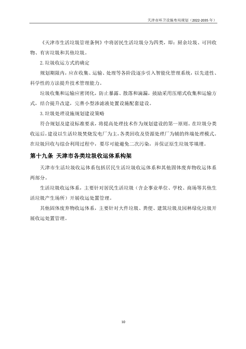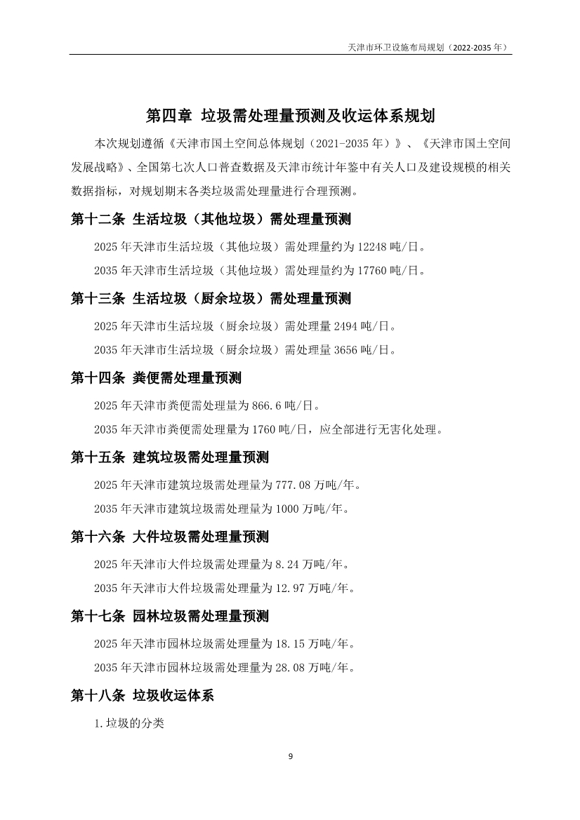 獲悉,日前,《天津市環(huán)衛(wèi)設(shè)施布局規(guī)劃》(2022-2035年)全文發(fā)布,本次規(guī)劃環(huán)衛(wèi)設(shè)施包括生活垃圾(其他垃圾)、生活垃圾(廚余垃圾)、糞便、建筑垃圾、大件垃圾及園林垃圾所涉及的環(huán)衛(wèi)設(shè)施。不包括危險(xiǎn)廢物、工業(yè)固廢、醫(yī)療廢物所涉及的處置設(shè)施。依據(jù)《城市環(huán)境衛(wèi)生設(shè)施規(guī)劃標(biāo)準(zhǔn)》(GB/T50337-2018),環(huán)境衛(wèi)生設(shè)施分為環(huán)境衛(wèi)生收集設(shè)施、環(huán)境衛(wèi)生轉(zhuǎn)運(yùn)設(shè)施、環(huán)境衛(wèi)生處理及處置設(shè)施和其他環(huán)境衛(wèi)生設(shè)施四類。