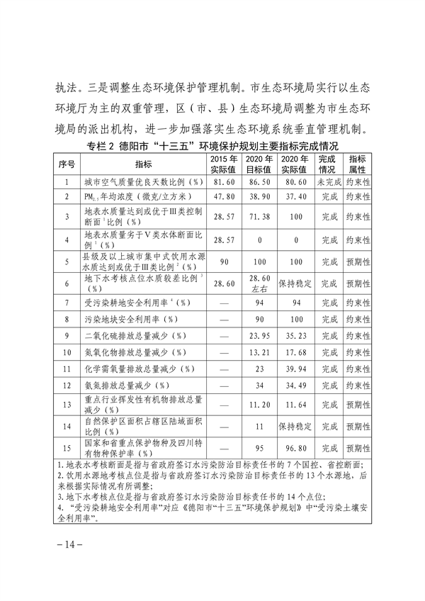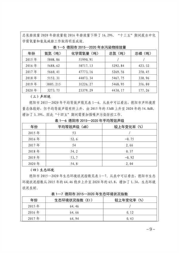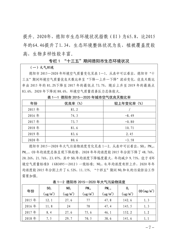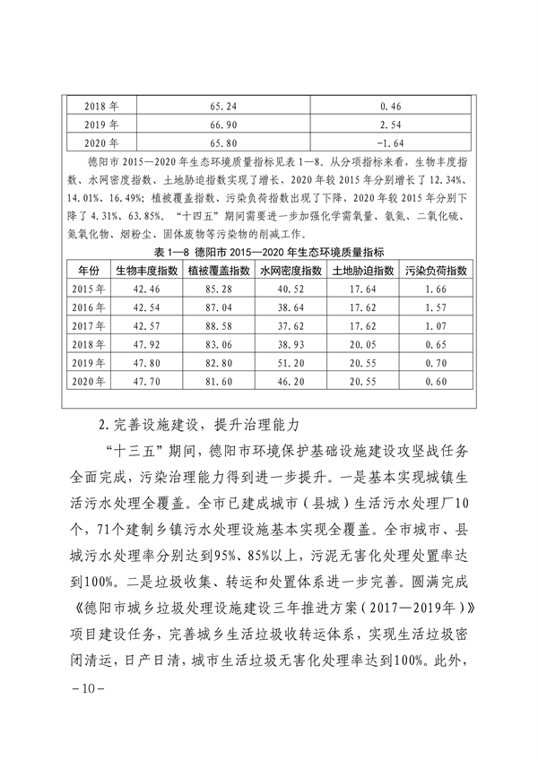 《德陽市“十四五”生態(tài)環(huán)境保護規(guī)劃》發(fā)布,制定了德陽市“十四五”期間生態(tài)環(huán)境指標共20項,其中約束性指標17個、預期性指標3個,包含環(huán)境質(zhì)量類指標6項,污染治理類指標7項,氣候變化類指標3項,生態(tài)保護指標3項。提出推動綠色低碳發(fā)展、積極應(yīng)對氣候變化、改善大氣環(huán)境質(zhì)量、提升水生態(tài)環(huán)境質(zhì)量、推進凈土減廢防污、強化核與輻射及噪聲監(jiān)管、加強環(huán)境風險防范、加強生態(tài)保護修復、實施區(qū)域環(huán)境協(xié)同聯(lián)防聯(lián)治、構(gòu)建現(xiàn)代環(huán)境治理體系十大重點工作任務(wù)。