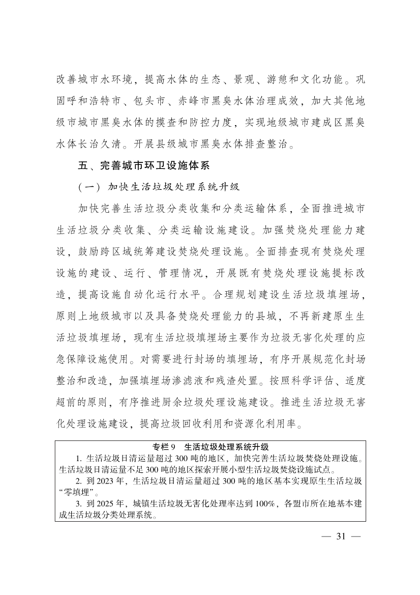 深入開(kāi)展節(jié)水型城市建設(shè),提高再生水利用水平。加快城鎮(zhèn)生活垃圾處理設(shè)施建設(shè),推進(jìn)生活垃圾焚燒發(fā)電,減少生活垃圾填埋處理。