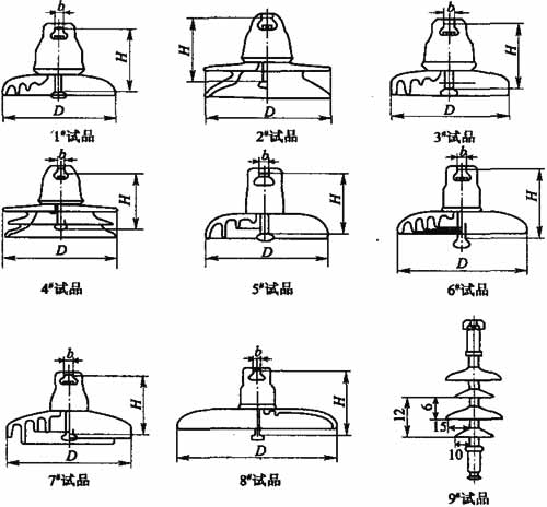 B.0.1 各種絕緣子的特征指數(shù)m1參考值應(yīng)符合表B.0.1-1的規(guī)定。瓷和玻璃絕緣子試品的尺寸應(yīng)符合表B.0.1-2的規(guī)定,各種絕緣子試品的形狀見(jiàn)圖B.0.1。