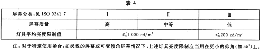 表4列出了在正常觀察方向上有可能在VDT屏幕上造成反射的燈具下射光的亮度限制。給出的燈具表面平均亮度限制是指圍繞燈具下垂線以上65°和更大高度角上的亮度,工作面采用豎直的或最大傾斜角為15°的顯示屏。