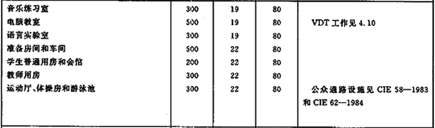 在第5章中針對不同活動列出了可以計量的參數(shù)如照度、不舒適眩光和顯色指數(shù)的設(shè)計值。